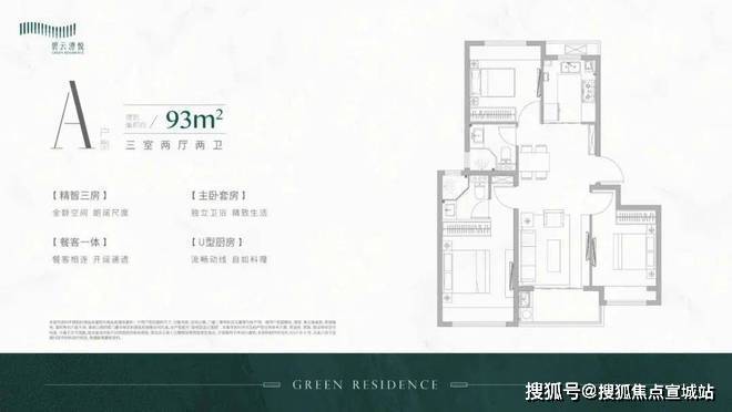 建面约 93㎡三房两厅两卫:得房率约 76%,总价约 459-485 万,三开间朝南,南北双阳台,U 型厨房窗对窗,主卧套房带 L 型衣帽区。