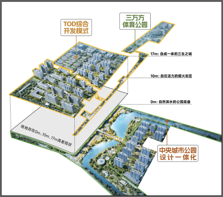 L形公园西侧是保利光合里街区,街区串联起保利光合上城、保利光合臻园、保利光合跃城,由此组成保利光合TOD,TOD以沟壑、斜面、台地等空间形态肌理勾勒出独特的艺术曲线。