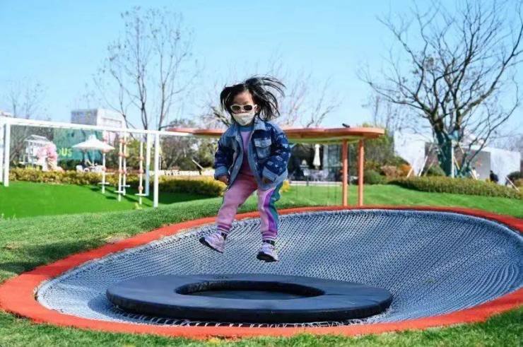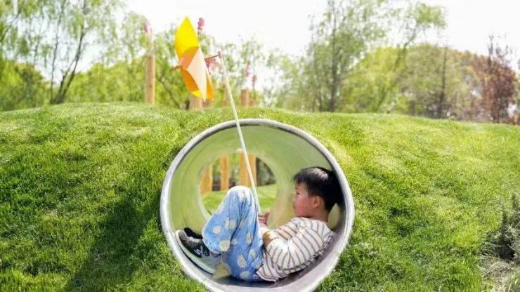 利用起伏的地形还有一个超600平方米的儿童活动区,草地上的隧洞森林设计成了可趣味攀爬的互动墙和知识科普墙,可以带娃去探索。