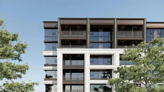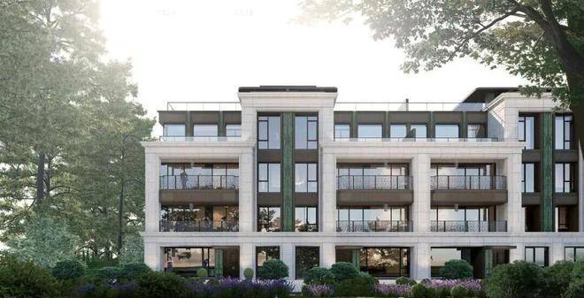 洋房立面以大面积干挂石材结合金属饰面为主基调,营造出现代典雅的整体风格。