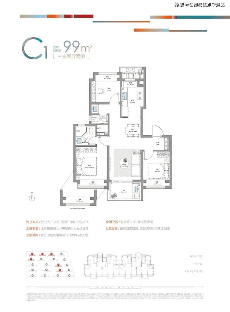 建面约99㎡三房:该户型是典型的飞机格局,很大程度上提高了使用率无走道浪费+多飘窗设计,让视觉大大向外延伸,“小家也可以住得不小”特别值得一提的是,建面约99㎡还做到了独立玄关+双卫配置,大大提升了业主的私密感