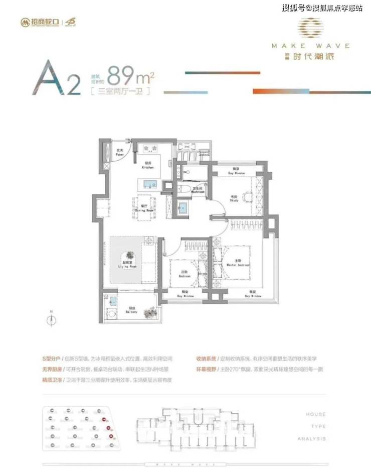 招商时代潮派售楼部电话:400-8080-420☎建面约89㎡3房户型:东边套主卧配置约270°双向采光飘窗、S墙设计,主力总价仅约450万级,首付约90万起!首先,S墙的设计使得冰箱得以不占用厨房空间,将更多面积留给更多的生活场景