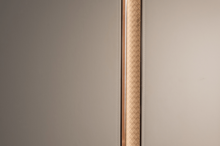 入户门用皮革精心包裹,触感轻柔顺滑,高级质感扑面而来。同时,横向竖向内嵌的金属线条增强了入户门的立体感,使这扇门兼具实用功能与艺术美感。