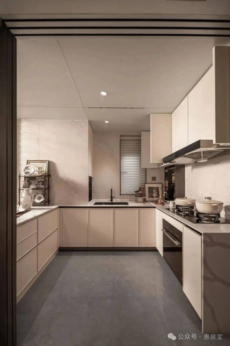 厨房更是收纳主场,设置了多功能调味拉篮、定制谷物抽屉,让瓶罐各归其位,烹饪时少了琐碎,多了诗意。