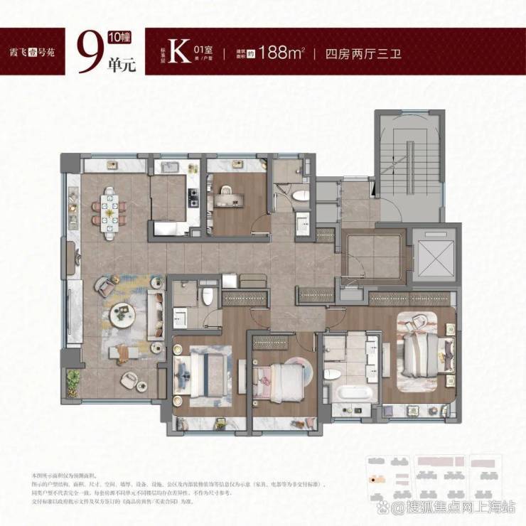再看建面约188㎡4房K户型,一梯一户,客厅餐厅正对桃浦中央公园,270度景观视野,超大景观面,目之所及皆是绿意。室内空间五开间朝南,而且是南向双卧套房,连主卫也朝南,采光通风充沛,功能和尺度比肩市区10万+豪宅项目!