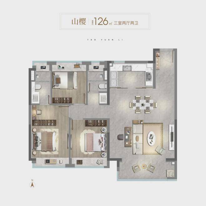 户型设计 充分考虑了现代家庭的需求:从83㎡两房到178㎡四房,全系列产品覆盖了不同阶段的置业需求。其中,106㎡三房两卫和126㎡三房两卫是主力户型,采用南北通透设计,户型方正,动线合理。