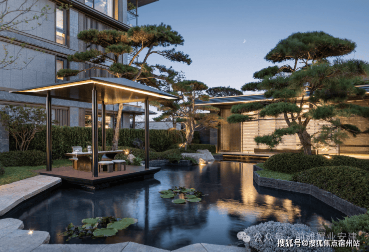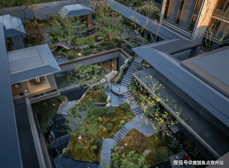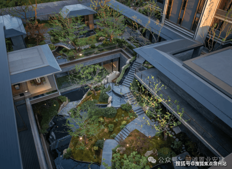 再往里走就是近460㎡的下沉式庭院 精选太行山金景石堆叠成小山丘,引进溪水汇聚成池塘,并移栽岭南珍贵的古桩铁冬青和中华原生乌桕树,形成一幅立体山水画卷。
