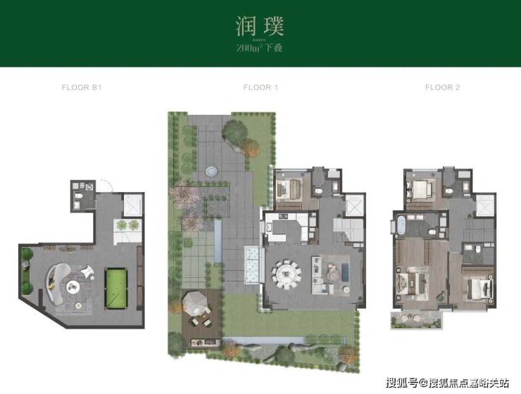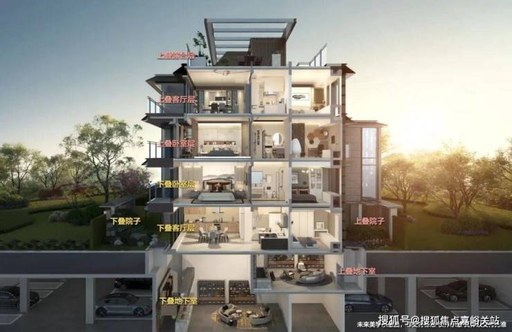 上叠从北绿地花园入户,经私家电梯直接进入3层或4层室内空间,或进入B1夹层地下室。