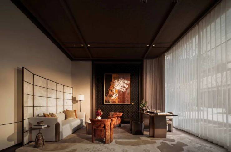整个公区的引入沉香米黄、透光云石、安哥拉黑、福鼎黑、橙皮红、宝格丽紫 等近二十种全球奢石,宛如一座流动的奢石博物馆。