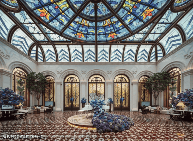 「莳花荟」穹顶的超大彩绘玻璃,以白玉兰为主题融合欧洲镶嵌工艺,设计团队历经三轮打样、上百块玻璃甄选调试,才让色彩与通透度达最佳。
