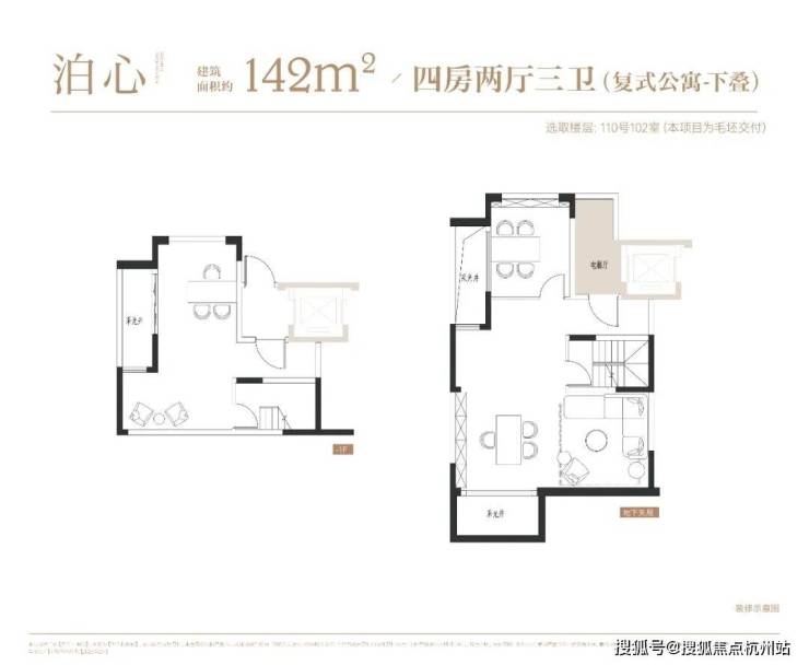 4层叠墅分为上/下叠,上叠建筑面积约139㎡,下叠建筑面积约142㎡,均为4房设计。