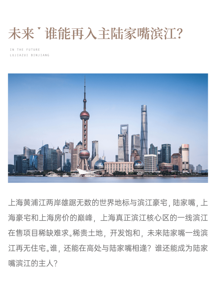 项目地处上海陆家嘴金融贸易区,近江约100米。陆家嘴被誉为中国的华尔街,更是上海的金融中心、经济中心和贸易中心,是全球金融中心,陆家嘴金融城,与纽约华尔街、伦敦金融城并称为世界三大金融中心,陆家嘴滨江,也成为并肩纽约中央公园、伦敦海德公园的顶级资本豪宅区,成为世界豪宅的中国封面。