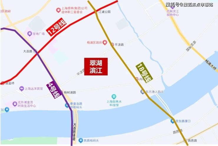 交通方面, 周边1公里内有多条轨道交通,东侧约400米有18号线平凉路站,西侧约700米是4号线杨树浦路站,西北侧1公里为4、12号线大连路站。地块到东外滩滨江的直线距离约580米。