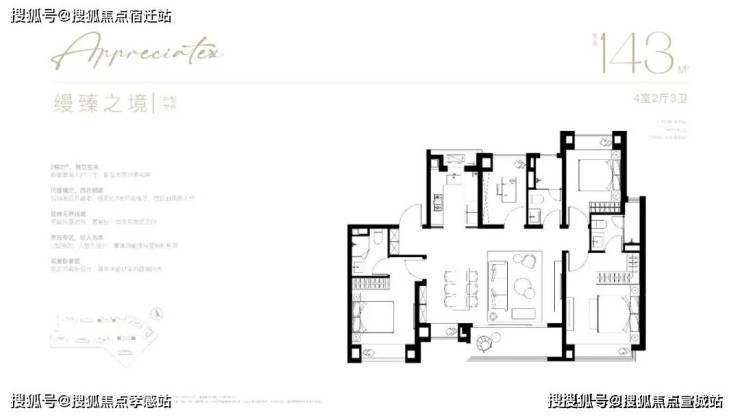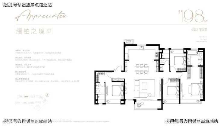 户型:有 105-198㎡的 3/4 居室户型,主力户型包括 105㎡三房、123㎡三房、143㎡四房、172㎡四房、198㎡四房等。