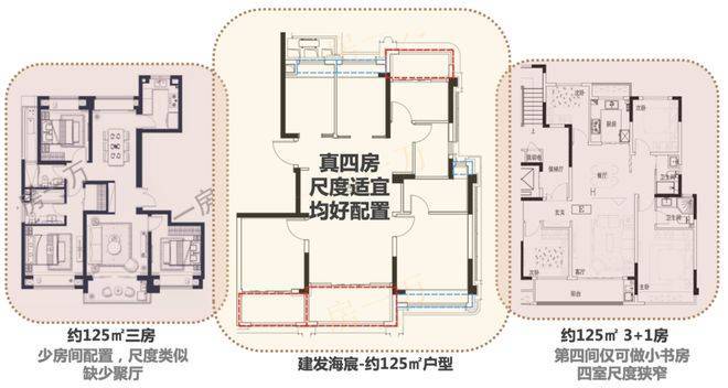 而与右侧的3+1房相比,则可以明显看出建发海宸项目四房的均好性,并没有牺牲真正的使用功能。