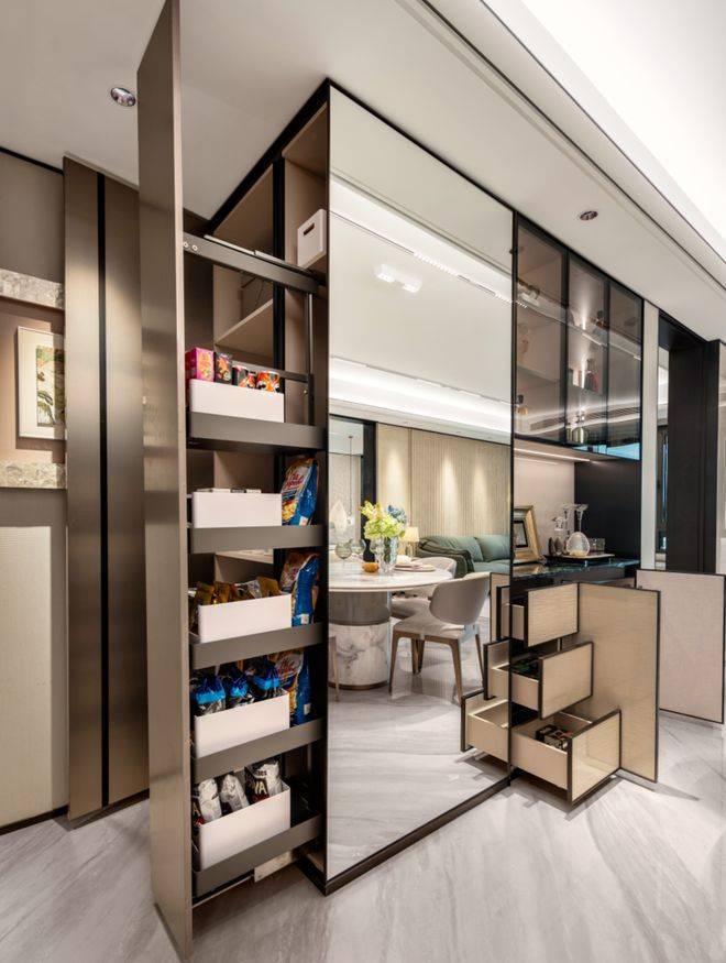 另一侧正面可做餐边柜,侧面则预留了足够的厚度。设计师巧妙结合了两种柜体:抽拉的薄柜藏在背后,外侧的深柜则完全可以容纳行李箱。