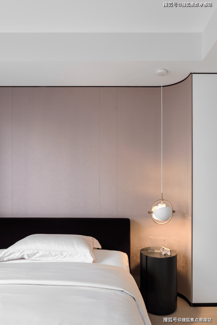 私密场域依旧保持静谧,黑白色基础上搭配了更多的色彩,例如深棕、浅紫等,艺术品的衬托深邃迷人,热络了家的氛围。