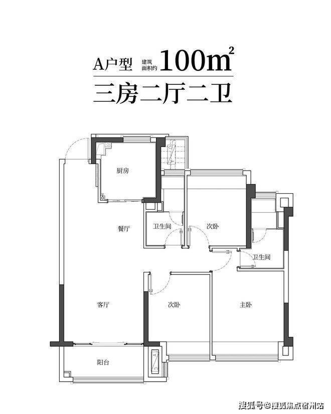建筑面积约100㎡雅致三房两卫,满足二娃时代;