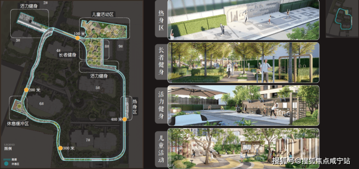 五大运动活力系统:热身区、定制主题儿童活动区、老年健身区、活力健身区和休憩缓冲区,并由约400M跑道串联