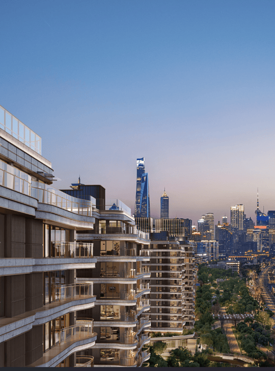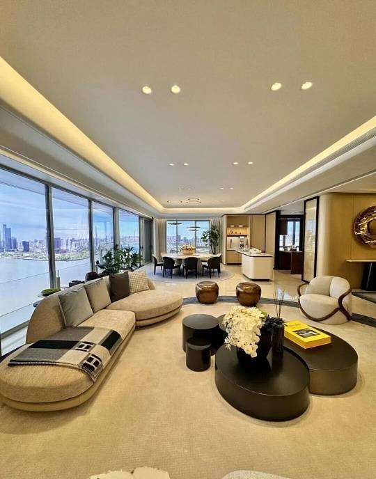 住宅部分:由12栋16-26层滨江大平层组成,仅368户,主力户型为建面约210-580㎡三至五房,层高3.3米,得房率超82%。建筑立面采用进口葡萄牙米黄石材与玻璃幕墙,搭配270°转角窗设计,实现“户户观江、室室有景”。