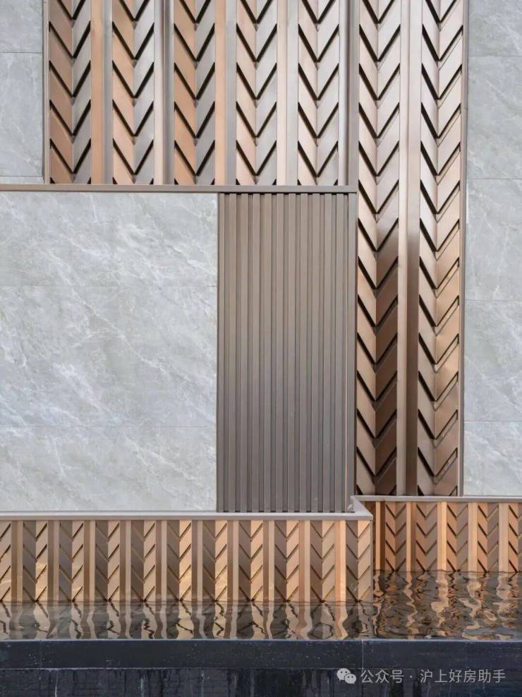 项目外立面通过古铜色、深灰色+铝板、镜面铝板的完美搭配,再镶嵌竖向线条和立面层次,体现出威仪肃穆的高级感。