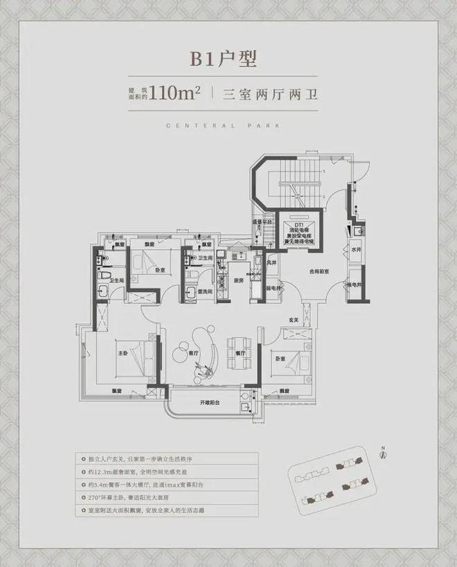 建面约110㎡中间套(B2户型)✅✅中环铂樾售楼处电话:400-8787-740✅✅,也同样做到了南北通透,三开间朝南,洄游动线,布局合理,无论是空间尺度还是通风采光,与边套享受一样的品质感!