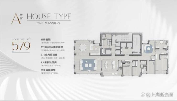 项目主力户型为建面约 434-579㎡的大平层,全系一层一户设计,两梯或三梯专属入户,保障绝对私密性。以 579㎡五房户型为例,南向面宽达 35 米,270 度全景落地窗将城市景观尽收眼底;客厅面宽超 15 米,进深近 17 米,可灵活布局社交、休闲与收纳空间;层高约 3.6 米,搭配无梁楼盖结构,空间开阔无压抑感。全套房设计、动静分区、智能家居系统(如 ABB 智能控制)与恒温恒湿系统,全方位满足高端家庭的生活需求。