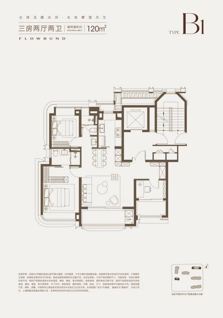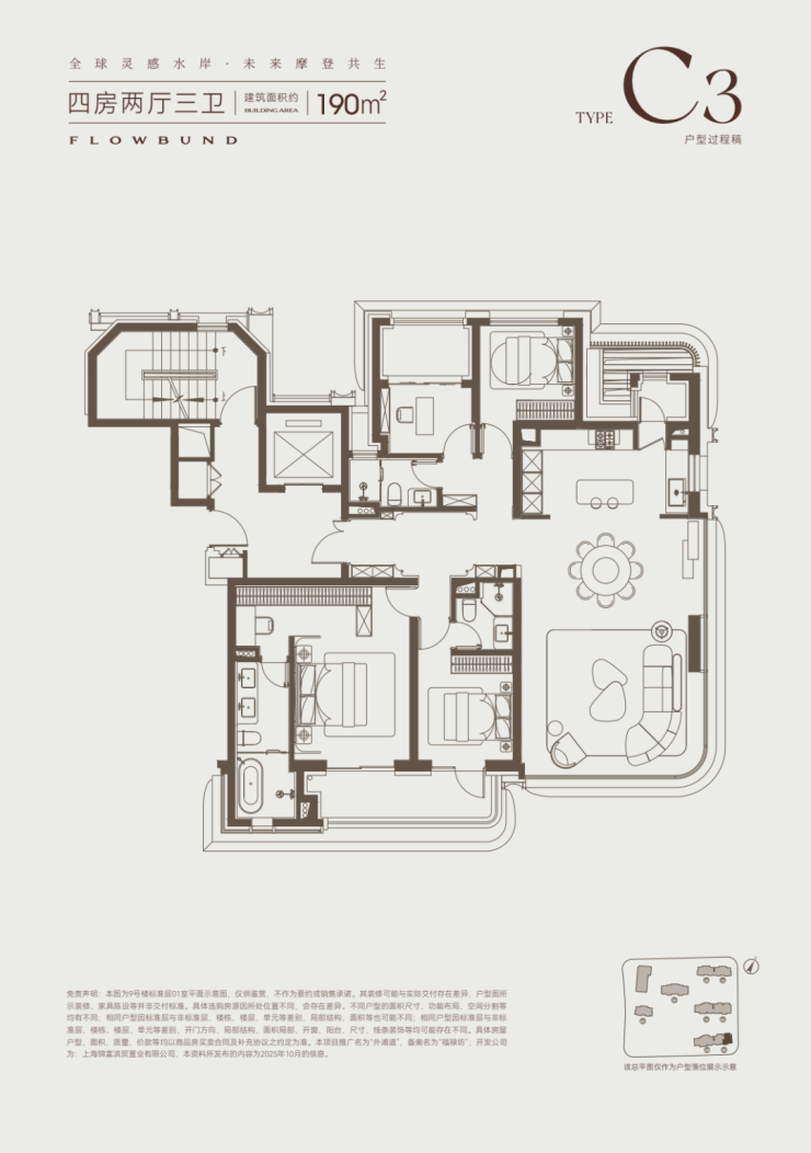 建面约195平四房为东边套,把最好的景观空间留给了餐客厅,拐角落地窗高区预计会有不错的江景视野。