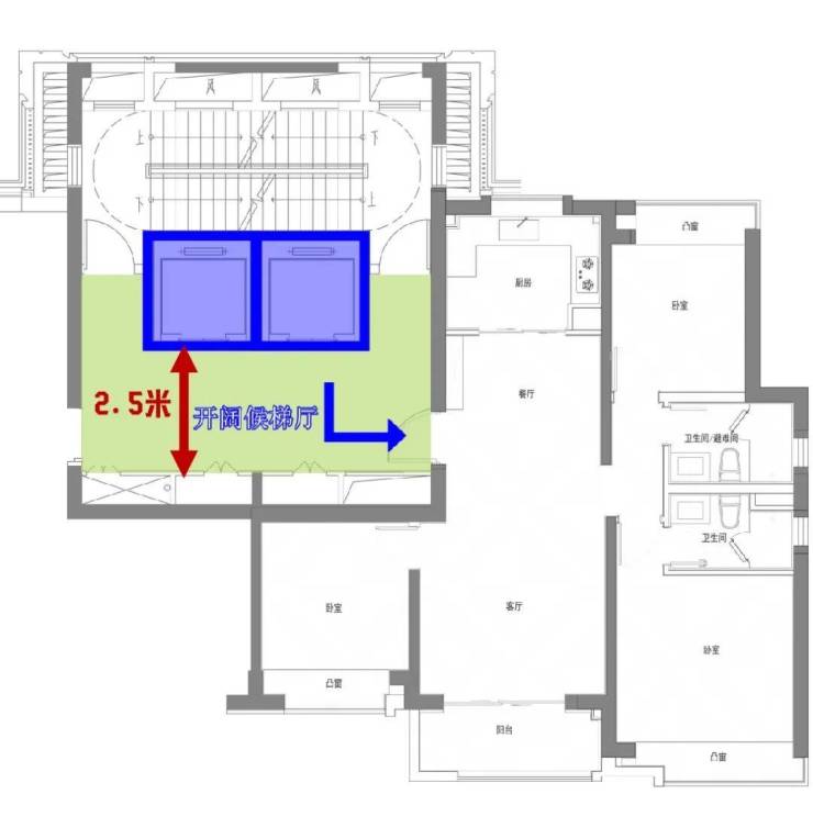 虹口源·717的140平户型的候梯厅短边净宽约2.5米,大幅超出规范标准,使用感受相当舒适。