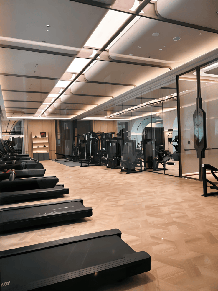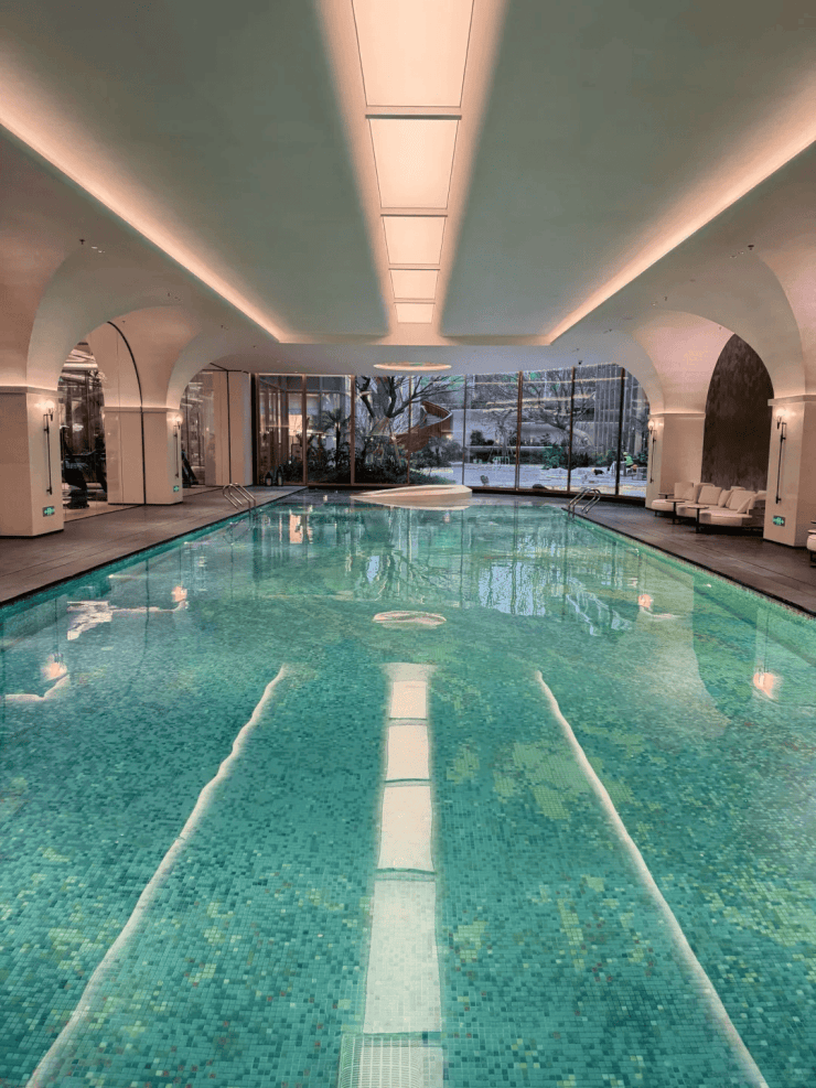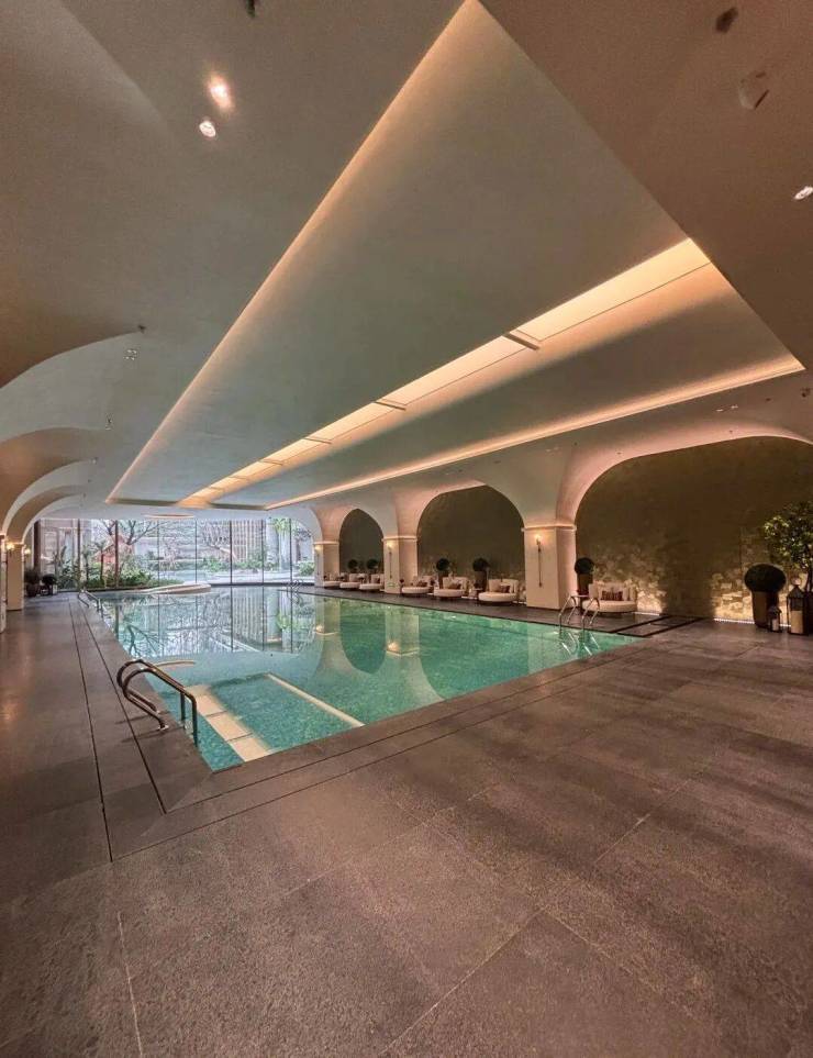 恒温泳池:天花板汲取松江古桥的拱形元素,池底铺满星空马赛克,仿佛在银河中游弋。健身馆:引进美国“必确”器械,高端酒店标配,落地窗外即是瀑布景观。私宴厅:墙面融入松江非遗“顾绣”工艺,让宴饮充满在地文脉的温度。