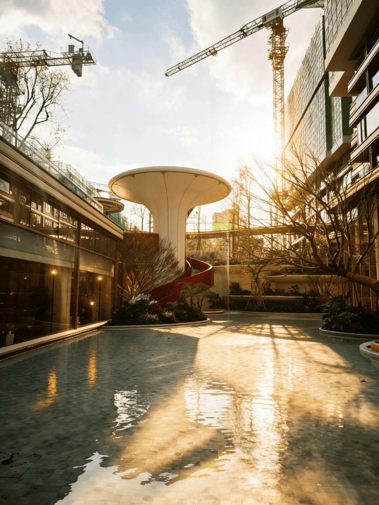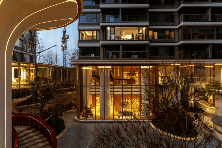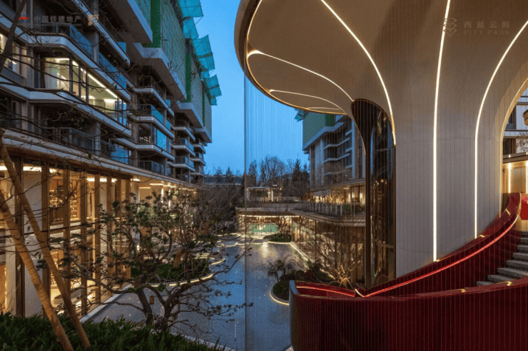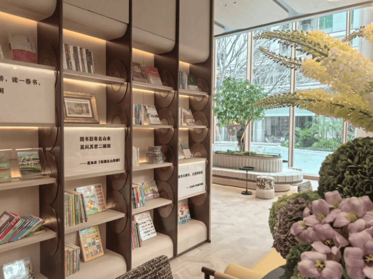 挑高约9米的双层书吧:一整面巨幕玻璃将水院景色框进室内,阳光穿过瀑布洒落书页,水声与翻书声轻轻应和。云间学堂与户外沙龙区:为孩子们提供席地而坐的阅读空间,也为社区音乐会随时上演提供舞台。此外,那座12米高的艺术水幕旋梯,堪称社区的“艺术坐标”,拾阶之间,光影流转,每一步都提醒你:生活,值得被认真对待
