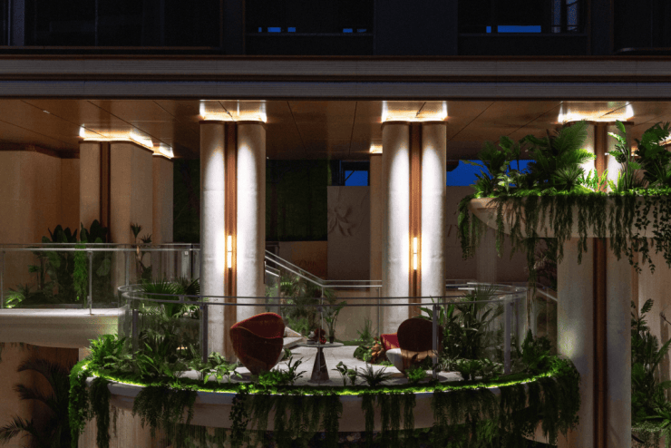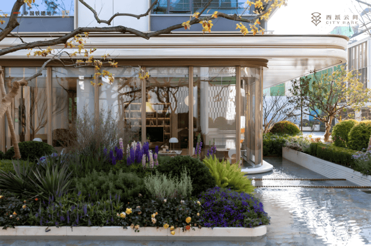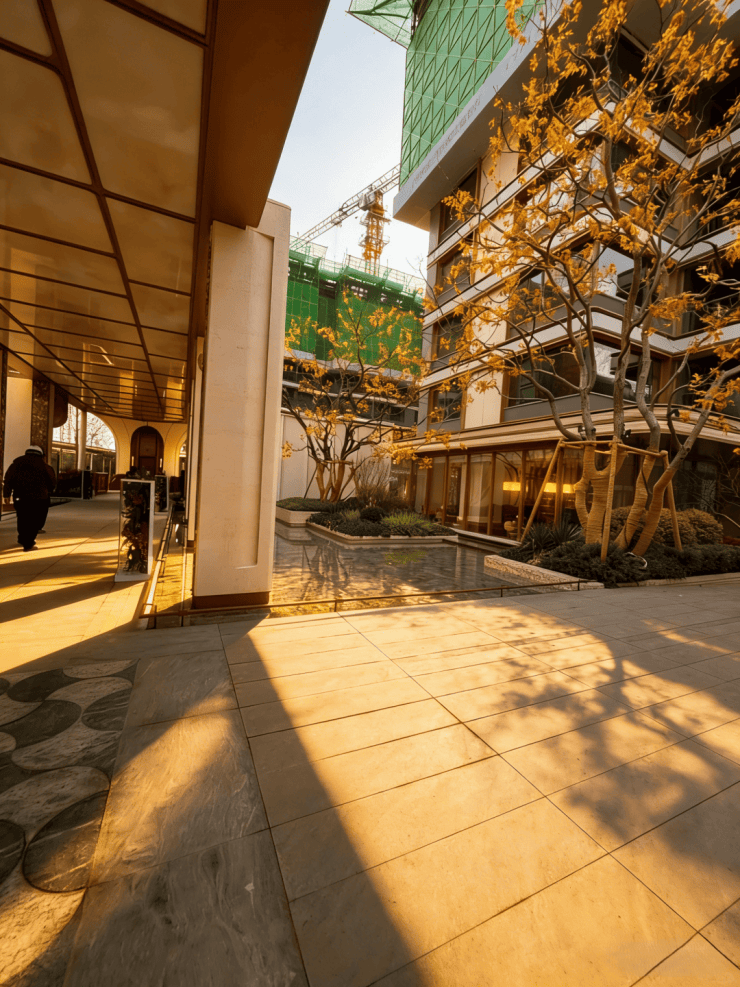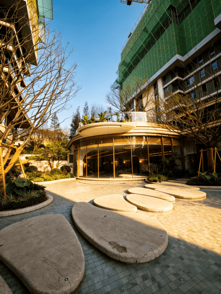西派云间带来的,不只是一座下沉式庭院,而是一座立体悬浮的岛屿。沿着浮溪廊桥往里走,空间豁然开朗。约1600㎡的立体瀑布水院映入眼帘,三座瀑布以不同高度凌空飞落,水声潺潺,足以覆盖城市的喧嚣。脚下是约1200㎡的镜面水景,倒映着天光云影。为了还原自然意境,设计师跨省寻来两棵树龄超过50年的朴树(树王),静立水畔,营造出“瀑谷秘境”的震撼视觉。在这里,景观不再是仅供观赏的“背景板”,而是可步入、可停留、可沉浸的生活现场。