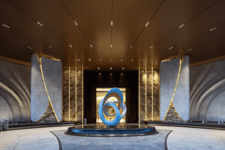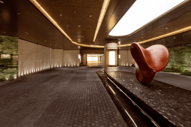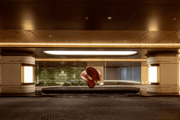 车库车马厅,地库入口对标伦敦TheWhiteley酒店中央车站,挑高约3.6米,环岛落客区、伊万翡翠奢石墙面、手工密拼弹石地面,地上地下双动线均享同等尊崇。