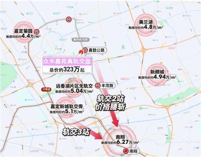 往前两站的南翔,新房均价站上6万+,两站地铁,价差约1.7万/平,同样买百平米三房,能省下将近二百万左右!性价比一目了然,