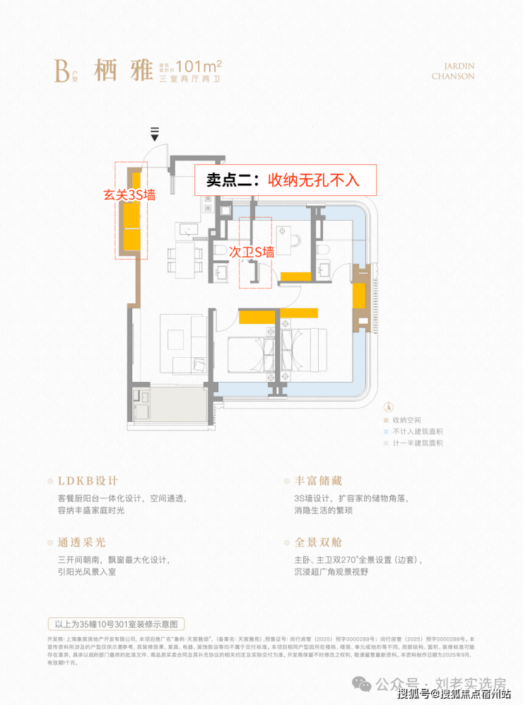 先看建面约101㎡边套户型,首先布局相当合理,三开间朝南+动静分区+客餐厅阳台一体化设计,采光、私密性和空间利用率全部拉满,3房2卫的配置也非常符合市场主流需求。 其次, 大量S墙的设计 简直见缝插针,极大的扩容了家的储物角落,消减了业主生活的繁琐。