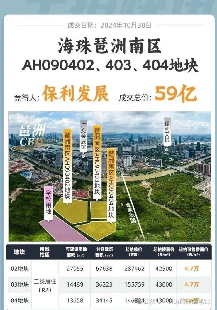 2024年10月30日,保利发展,付出了59亿+的总价,拿下了广州“压箱底”靓地——琶洲南三兄弟(AH090402号、03号、04号地块)。