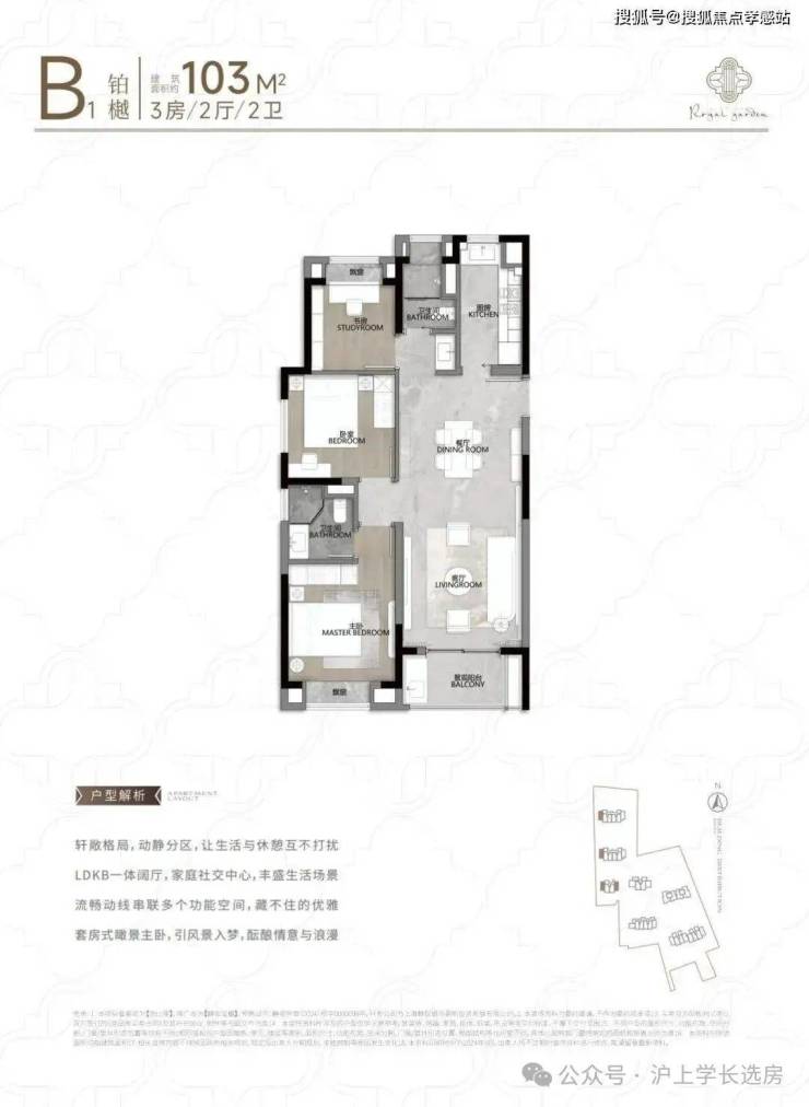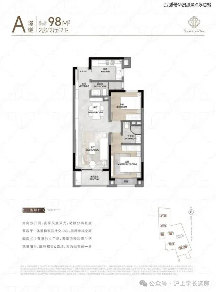 该户型多为楼栋的东边套,是一个观景户型。客厅连接270°阳台,视野出众。双卧朝南,阳光满溢。从次卫布局看,如果家庭人口较少,该户型还能做成双套卧。此外,还具有独立储藏间,非常难得。该户型比较适合三口之家或三代同堂居住。