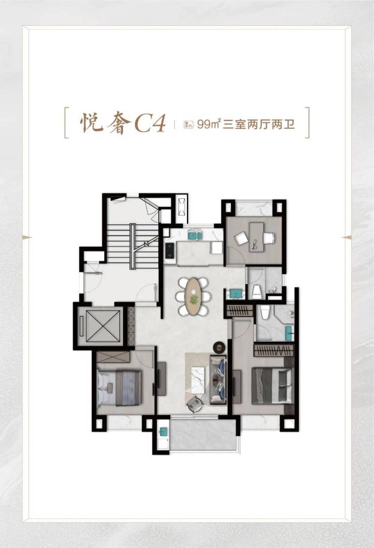 再比如C6悦尊户型,建面约96㎡3房2厅2卫,比C4悦奢户型少3㎡,总价也适当降低。C4户型该有的优点,也全都有,比如: