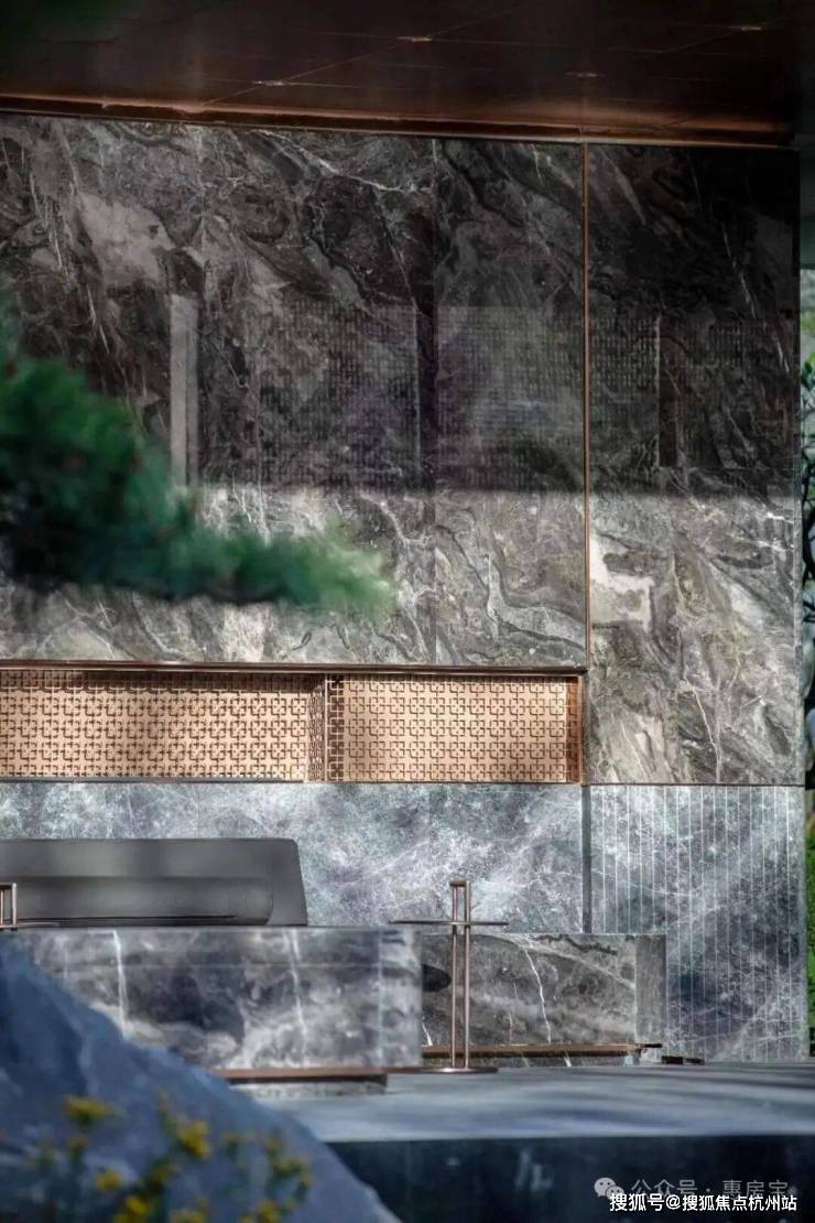 位于社区中央的第二景观会客厅聆星客厅,立面装饰有极具典藏价值的威尼斯棕奢石、吊顶采用铝板切割镶嵌、地面采用阿尔卑斯灰和福鼎黑拼花铺装。