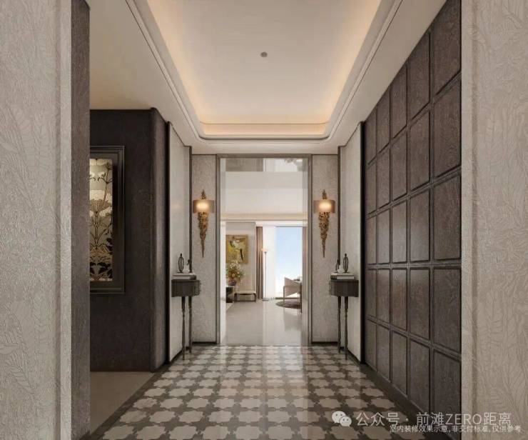 而且这个空间的装标也是非常精致的,1.7米双扇铸铝门,搭配宝格丽石材与祥云灰拼花,延伸至电梯厅。皇家白玉石玄关,兼具储物与展示功能,质感温润。