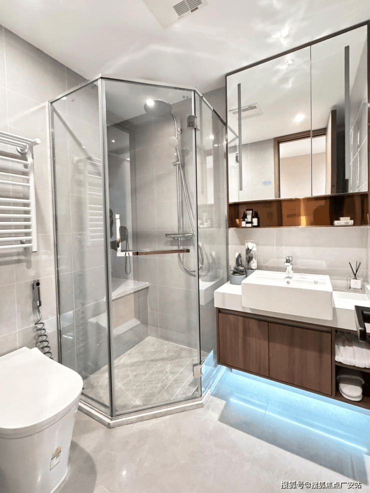 卫浴空间是私享生活的精神领地.建面约145㎡采用双卫设计,并且客卫做到了干湿分离,日常使用,互不干扰;主卫则功能齐配,使得生活用品可以各安其位.除汉斯格雅淋浴、奥普浴霸凉霸等知名品牌配置外,上实·吴淞道1號还特别携手科勒品牌,甄选“女王座”智能马桶,专为女性需求定制,让精装细节成为体贴入微的关照.