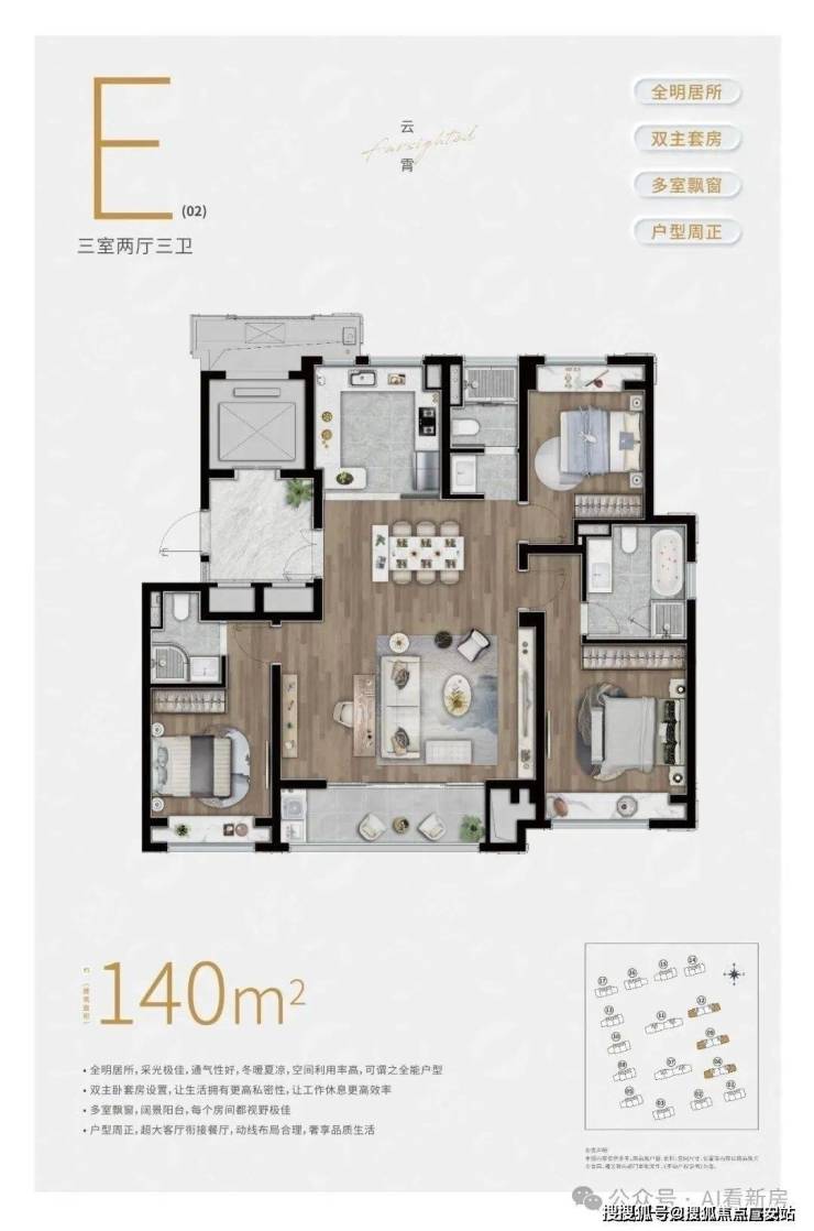 E户型:建面约140㎡3房2厅3卫▼
