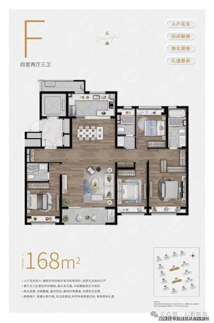 F户型:建面约168㎡4房2厅3卫▼
