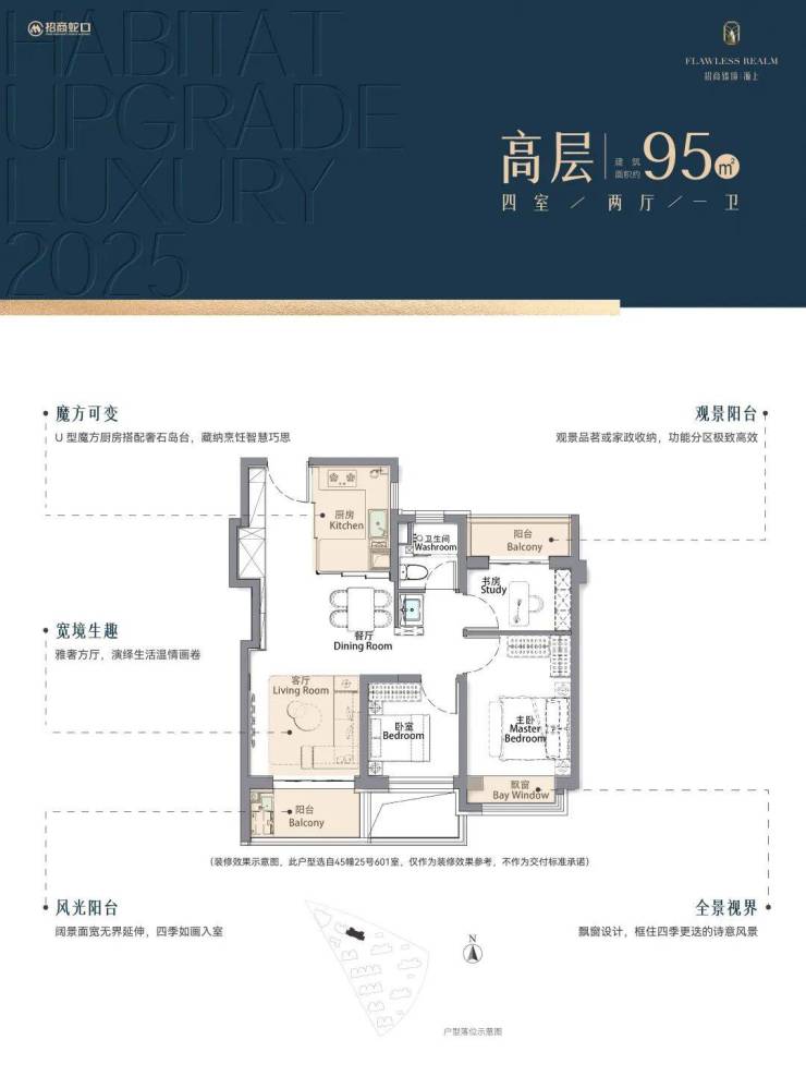 再加上南向大面宽短进深、全卧飘窗、L型转角阳台设计,哪怕小户型95㎡3房,尺度感都超棒,采光和视野更是一流。