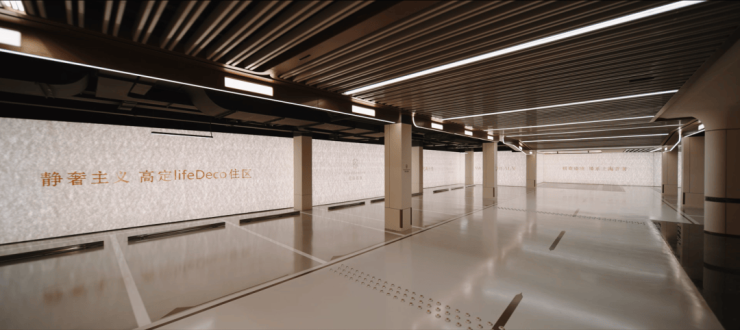 过去在豪宅项目才能看到的类似于“星空顶”地下车库坡道,招商臻境使用了看来更加高级的香槟金色吊顶,并加上穹顶闪耀的“追光”坡道!精装的地下大堂,配置了