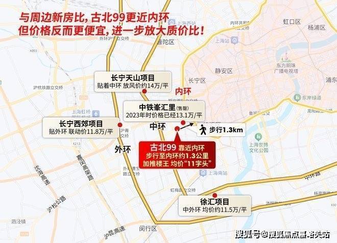 其次,古北99步行到内环只有约1.3公里,均价“11”字头,而长宁天山项目贴着中环,预计14万/㎡;长宁西郊项目贴着外环,联动价11.8万/㎡。