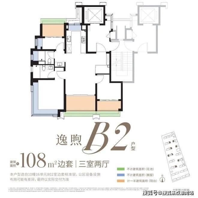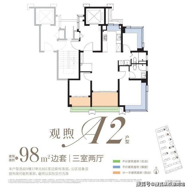 约98㎡3房:类一梯一户、全屋飘窗为标配,双阳台+花池是核心亮点(市面双阳台户型起步多为约110㎡),整体附赠约23㎡,是罕见的高实得率精致户型。