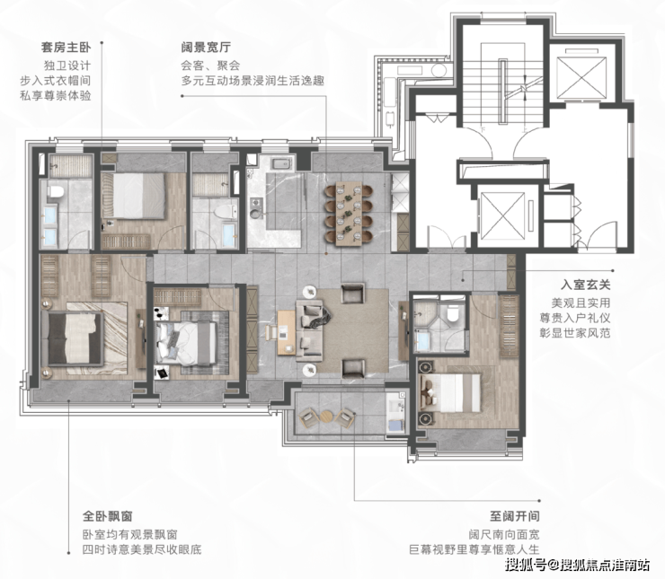 建面约155㎡奢悦四房,以双套间主卧设计,精准回应这一需求:私享主卧套间,形成互不干扰的生活圈,既能保留年轻人的社交主场,又为长辈打造专属天地,精准匹配新中产家庭的代际居住需求。南向社交宽厅,承载家庭聚会、朋友宴请、甚至孩子的生日派对,让每一份生活仪式感都有处安放。