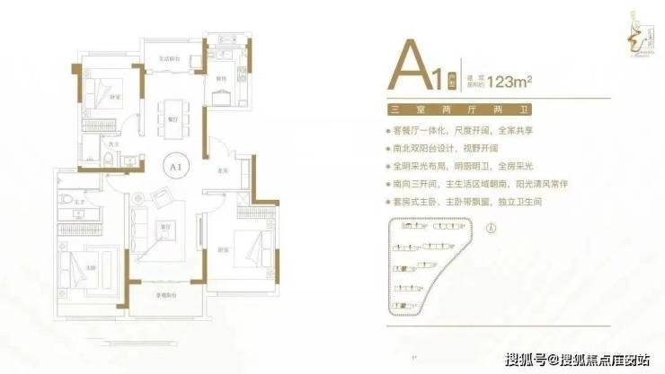 建面约123㎡三室两厅两卫户型特点:客餐厅一体化,尺度开阔,全家共享;南北双阳台设计,视野开阔;全明采光布局,明厨明卫,全房采光;南向三开间,主生活区域朝南,阳光清风常伴;套房式主卧,主卧带飘窗,独立卫生间。