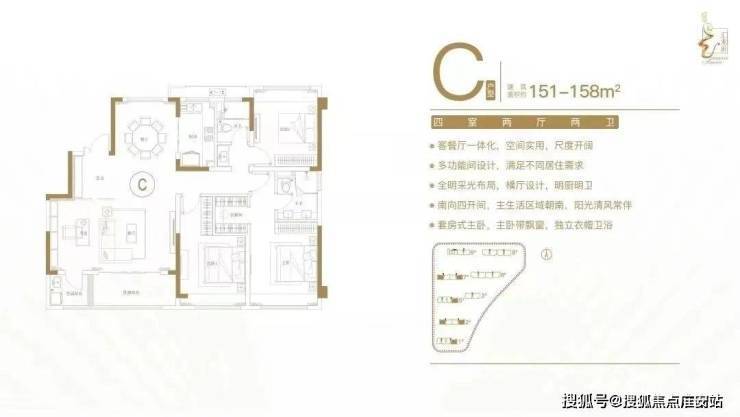 建面约151-158㎡四室两厅两卫户型特点:客餐厅一体化,空间实用,尺度开阔;多功能间设计,满足不同居住需求;全明采光布局,横厅设计,明厨明卫;南向四开间,主生活区域朝南,阳光清风常伴;套房式主卧,主卧带飘窗,独立衣帽卫。